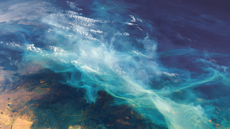 A satellite methane plume over coastal landscape, atmospheric gas plume, ocean currents, aerial view, environmental monitoring, blue green haze