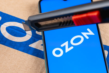 Ozon logo on the screen smartphone closeup. Smartphone on the background of the parcel. The parcel is opened with a box cutter.
