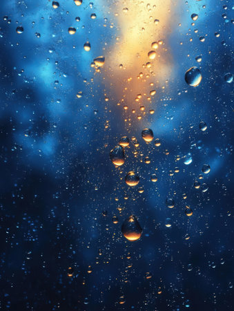 Water drops on a window glass with blue background. Abstract texture.