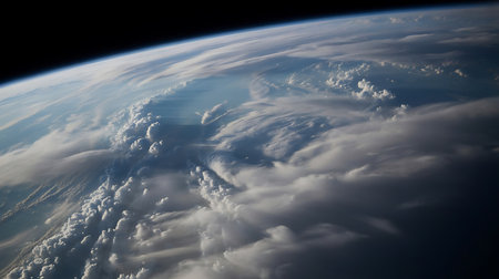 A breathtaking aerial image showcasing the curvature of Earth against the deep blue of space, accentuated by fluffy clouds and atmospheric layers, evoking a sense of wonder.