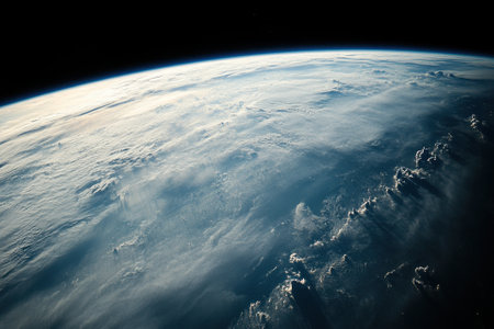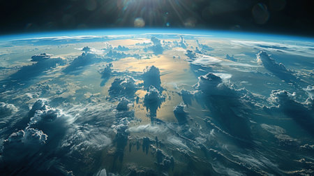 A captivating image of Earths atmosphere, viewed from space, with sunlight reflecting off the clouds.