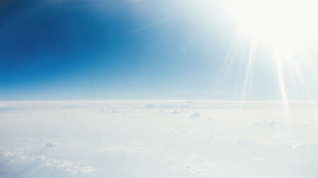 Aerial view of the sun above the clouds, space stratosphere, light and solar reflections on the clouds. Global warming, climate change. Ozone hole. Mountain range. 3d rendering