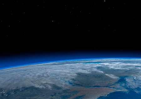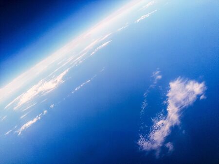 Curvature of planet earth. Aerial shot. Blue sky and clouds over land