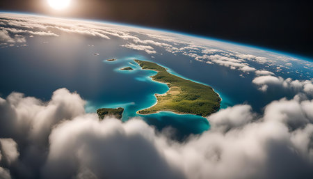 A breathtaking aerial view of a lush green island surrounded by turquoise waters and white clouds. The island appears to be a tropical paradise, with its pristine beaches and lush vegetation. The photograph was taken from above the clouds, giving the viewer a unique perspective of this idyllic location.