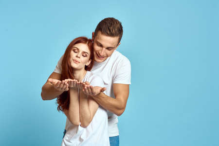 Cheerful man and woman in white t-shirts embrace friendship together