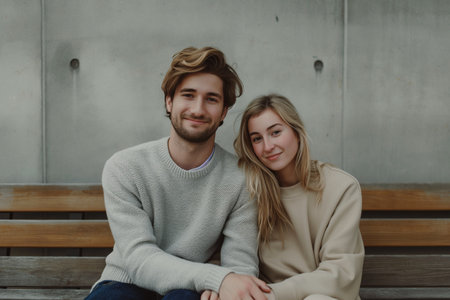 Smiling couple sitting on a bench outdoors, showcasing love and companionship on a cozy day.