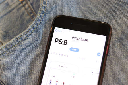 Phone with Pull and Bear icon on screen in blue jeans pocket close-up. Los Angeles, California, USA - 30 November 2019, Illustrative Editorial.