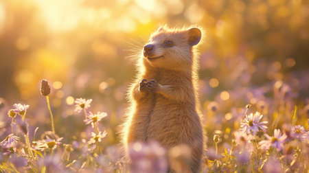 A quokka on a remote island, standing on hind legs with a cheerful expression, surrounded by wildflowers and soft sunlight.