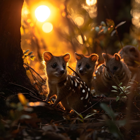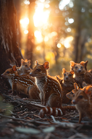 Quoll family in the forest with setting sun shining. Group of wild animals in nature.