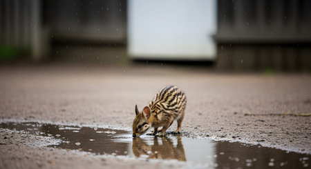 A tiny, striped baby wild boar piglet stands on a wet paved surface, drinking from a small rain puddle. The image captures the animal's reflection in the water and the falling rain, highlighting a moment of survival in an urban or edge-of-nature setting.