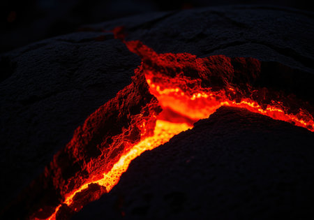 Glowing molten lava flows through dark, cracked volcanic rock crevices. intense heat and dramatic texture visible in this close up view, symbolizing danger, geology, and raw natural power.