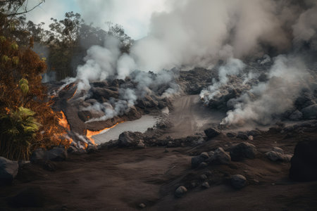 landslide on volcanic island with flowing lava and steam, created with generative ai