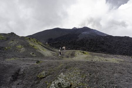 Tourists are walking on the path that takes them to the top of the Pacaya volcano.