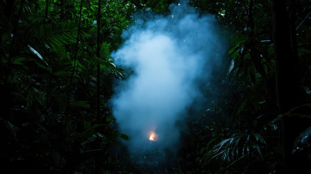 A forest with smoke in the air. The smoke is blue and it is in the middle of the forest
