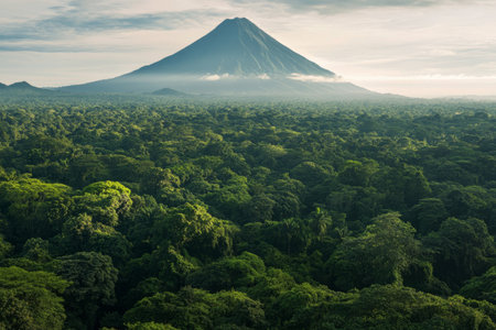 A breathtaking view of dense green forests stretching towards the skyline with a towering volcano in the background, illuminated by soft morning light in Indonesia.