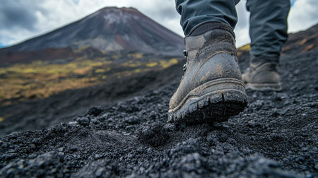 Boots treading on a volcanic trail with black ash and rugged terrain underfoot