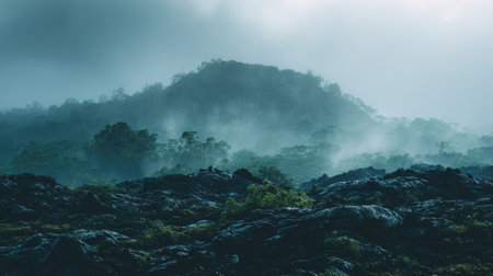 A breathtaking view of a misty mountain landscape characterized by rocky terrain and lush greenery, creating a tranquil and mysterious atmosphere in the wilderness.