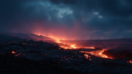 Dramatic volcanic landscape with fiery lava flow