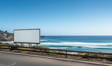 Blank billboard on the road with blue sky and ocean in background