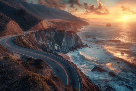 An aerial shot of a stunning coastal road with sweeping ocean views, dramatic cliffs, and the sun setting on the horizon, casting a golden glow.