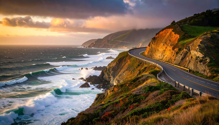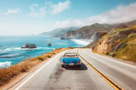 scenic road trip down the coast with rolling waves and scenic views, created with generative ai