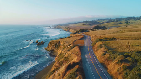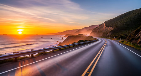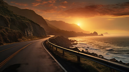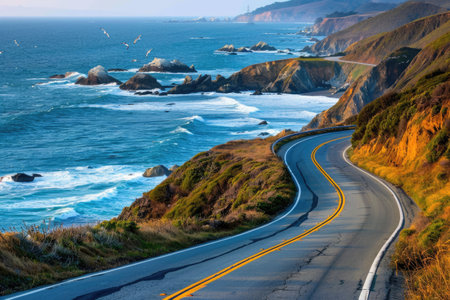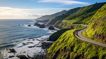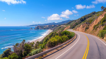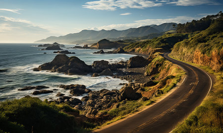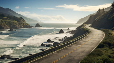 A picturesque drive along the coast offers stunning views of the expansive ocean and its neverending horizon. The road hugs the rugged . AI generation