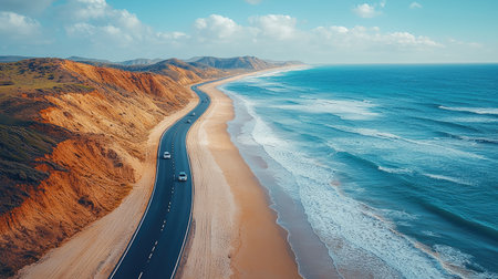 scenic road trip along the coast, with the blue ocean and waves visible in the background, created with generative ai