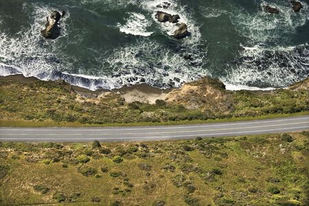 Aerial of coastal scenic highway along Pacific Ocean on California west coast, USA.