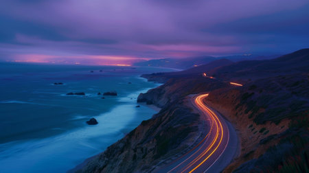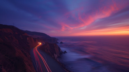 As the sun sets over the horizon car light trails illuminate the winding path along the coastal cliffs creating an otherworldly atmosphere
