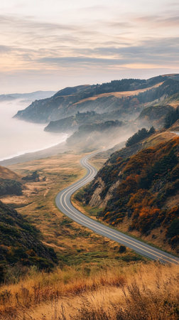 A drone captures a winding coastal highway hugging the cliffs, showcasing dramatic ocean views and lush landscapes under a serene sky during sunset, perfect for adventurous road trips.