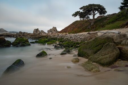 Sunrise at coast of Carmel, CA, beach shot with lone pine tree, moss on the rocks, long exposure to smooth out the water