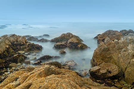 Serenity of Rocky Shores Meets the Peaceful Ocean Under a Foggy Sky in the Early Morning Light