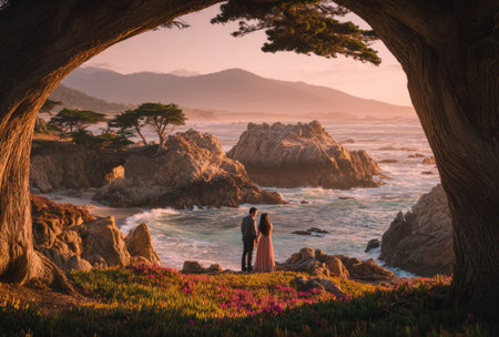 Couple stands holding hands, framed by a tree arch, overlooking ocean cliffs at sunset
