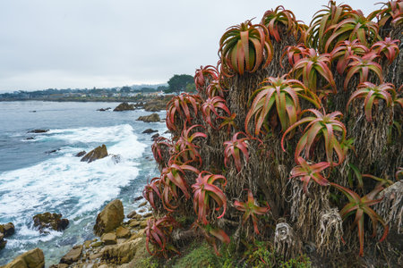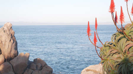 Red aloe cactus flower on rocky craggy shore, pebble beach, Monterey bay nature, California coast USA. Sea ocean water waves. Succulent plant bloom in park garden. 17-mile drive coastal flora. Horizon