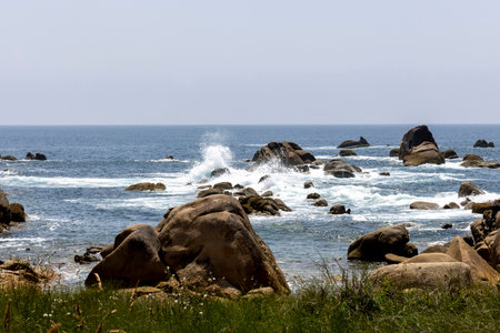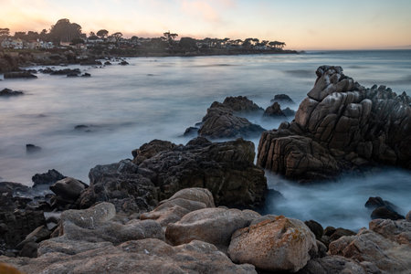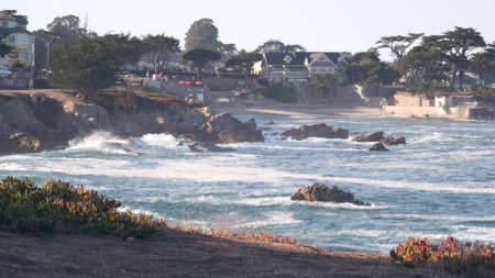 Rocky craggy ocean beach, sea waves crashing on shore, Monterey 17-mile drive, California coast, USA. Pacific Grove, beachfront waterfront promenade, waterside historic houses, colonial architecture.