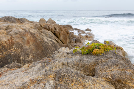 View of colorful flowers and algae on rugged coastline of Point Lobos State Natural Reserve in California