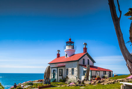 Battery Point lighthouse in Crescent City, CA. Under blue sky and low tide you can pass to the lighthouse