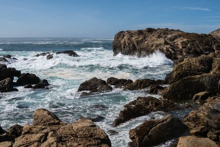 Pacific Ocean waves crashing on the cliffs of the rugged Northern California coastline in Monterey