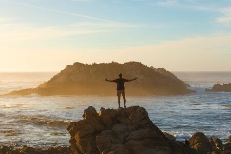 Traveler man with backpack enjoying ocean view, man hiker at sunset, travel concept, California, USA