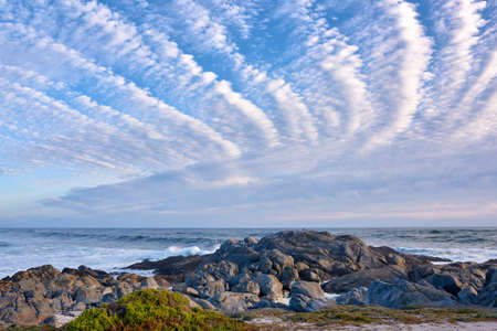 Copyspace at sea with a cloudy blue sky background and rocky coast in Western Cape South Africa. Ocean waves and boulders at an empty beach. Peaceful scenic landscape for a relaxing summer holiday