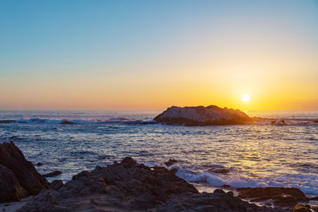 Long exposure of the coastline of Asilomar State Beach on a cloudles blue sky evening, California, USA