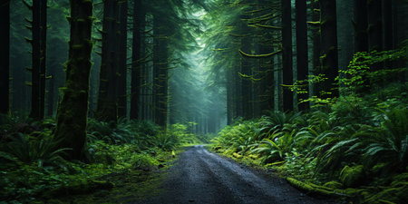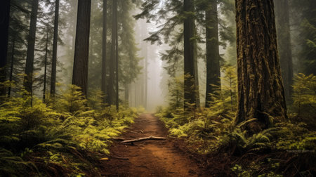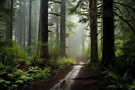 Mystical View of the Trail in Rain Forest during a foggy and rainy Winter Season. Woods in Squamish, North of Vancouver, British Columbia, Canada.
