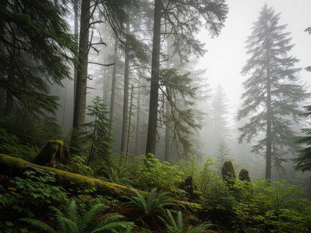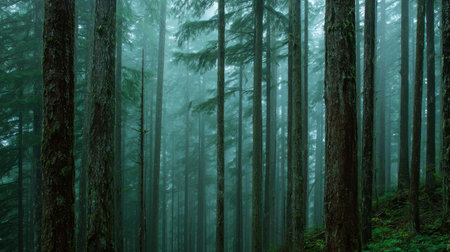 Mysterious evergreen forest in a fog. Mighty pine and spruce trees close-up. Atmospheric landscape. Nature, environmental conservation, ecology, ecotourism. Panoramic view