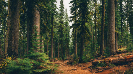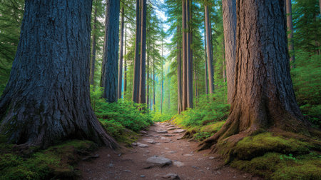 A tranquil forest pathway weaving through majestic pines, bathed in gentle sunlight that filters through needle-leaves, highlighting lush moss and vibrant greenery.