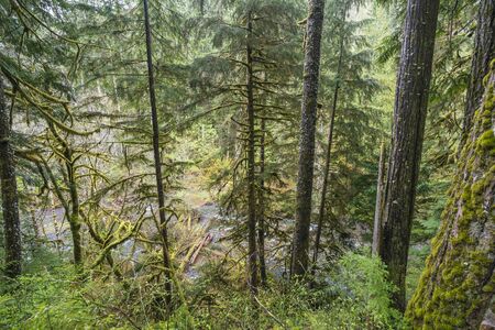 Thick green forest with tall old trees in Canada covering the streams of daylight