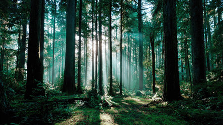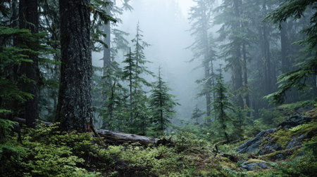 Tall evergreen trees stand gracefully in the forest, surrounded by a soft mist as the first light of dawn shines through. Nature awakens quietly in this serene setting.