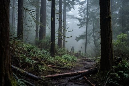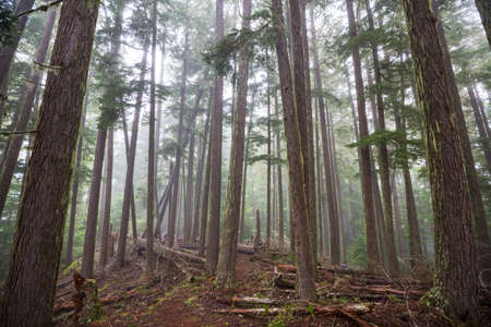 Gloomy dark forest during a foggy day. Taken in Mt Fromme, North Vancouver, British Columbia, Canada.