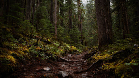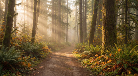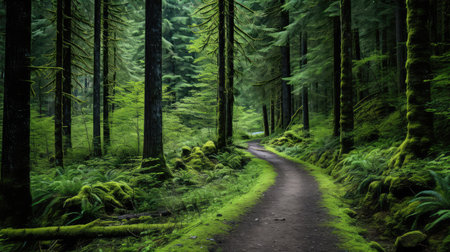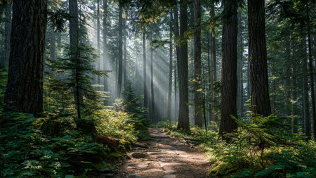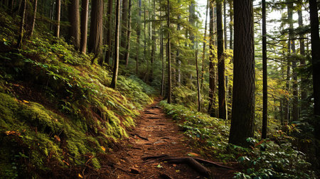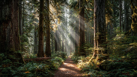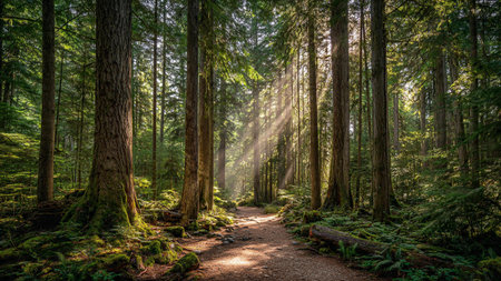 Sunlight filtering through towering trees illuminates a tranquil hiking trail winding through the lush undergrowth of cathedral grove on vancouver island
