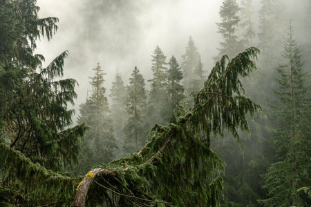 Wet Pine Tree Boughs Bend On Foggy Mountain Side in Mount Rainier National Park