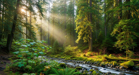 Sunlit Forest Stream With Lush Greenery and Tall Trees